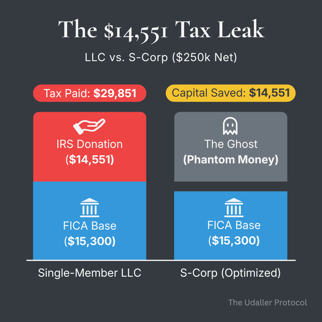 The IRS Donation (The Math): For a solo consultant netting $250,000 in 2026, standard LLC employment tax liability is $29,851.26 (full 15.3% SE tax + 0.9% Additional Medicare). By electing S-Corp status, paying a defensible $100,000 W-2 salary, and taking $150,000 as distributions, the employment tax drops to $15,300.00. The Sovereign Tax Shield preserves exactly $14,551.26 in capital in a single year.