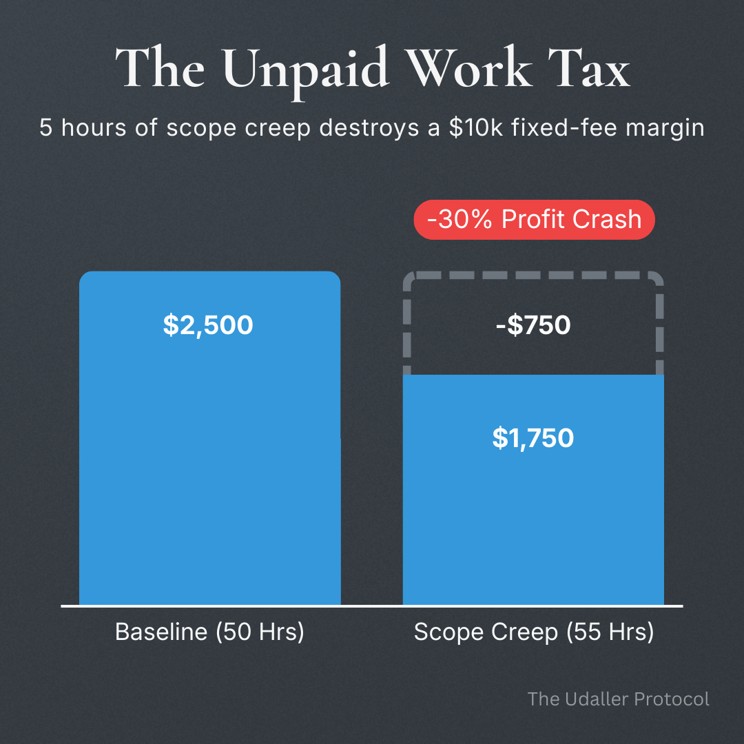 The Profit Crash: On a standard $10,000 fixed-fee engagement estimated at 50 hours, your Effective Hourly Rate (EHR) is $200. If you absorb just 5 hours of out-of-scope revisions—a 10% increase in labor—your EHR drops to $181.82. After accounting for a $150/hr operational overhead, your net profit compresses from $2,500 to $1,750. A 10% increase in unbilled labor destroys 30% of net profit.